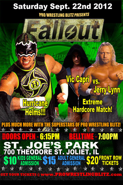 Nov 3 - Premier Pro Wrestling - Mundelein, IL -vs- T.B.A. Oct 27 - Pro Wrestling Blitz - Joliet, IL w/Ruff Crossing -vs- Matty Starr & Zac Thompson Oct 20 - GLCW - Racine, WI -vs- T.B.A. Oct 13 - POWW w/Brandon Blaze -vs- Threat Level Black Sept 29 - GLCW - Cedarsberg, WI -vs- 450 Hammett Sept 22 - Pro Wrestling Blitz